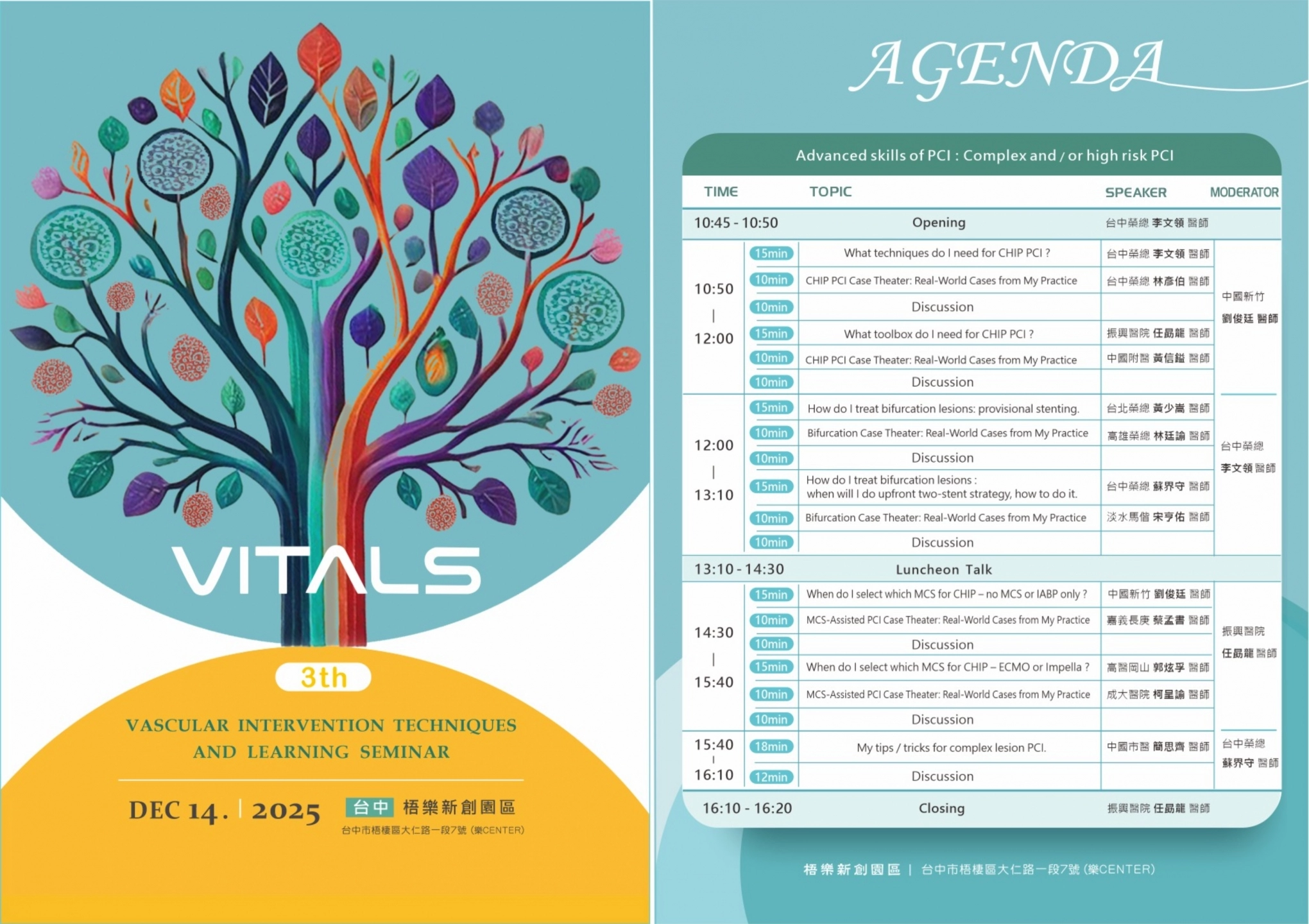 第三屆 《#Vitals醫學研討會》,榮幸邀請多位醫界頂尖學者齊聚一堂,針對「 複雜且高風險的心導管介入治療; Advanced skills of PCI : Complex and/or high risk PCI 」進行專題分享,為與會者帶來臨床實用價值的學術課程。